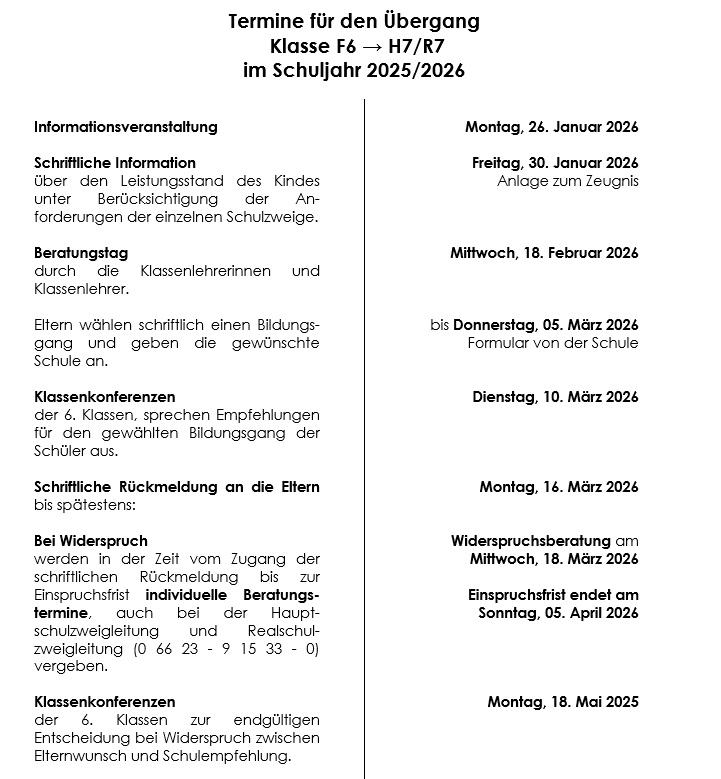 Termine für den Übergang Klasse F6 → H7/R7