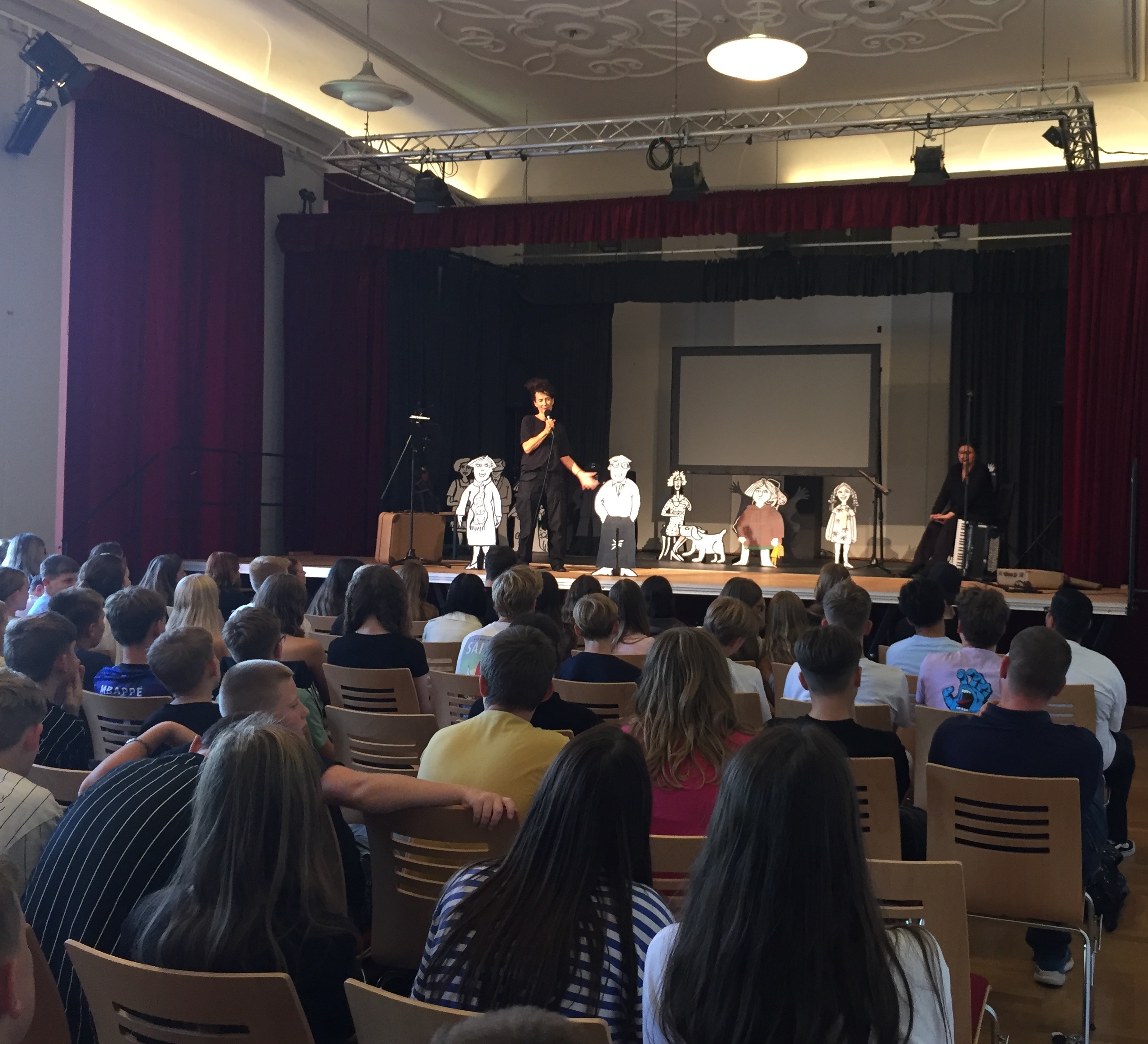 In der vergangenen Woche war die Schauspielerin und Theatermacherin Liora Hilb an zwei Tagen mit ihrem Theater La Senty Menti aus Frankfurt wieder zu Gast bei uns. Liora Hilbs Aufführungen vor Schülern der Mittel- und Oberstufe unserer Schule haben mittlerweile ihren festen Platz im Schulkalender gefunden, denn Liora Hilbs Stücke wecken Betroffenheit und Interesse—und setzen damit mehr als nur ein Zeichen gegen das Vergessen. Zusammen mit ihrer Schauspielpartnerin schlüpft die Bühnenautorin in mehrere Rollen. Eine Leinwandprojektion im Hintergrund und die geschickte Verwendung zahlreicher Requisiten leiten die jungen Zuschauer durch die Handlung.